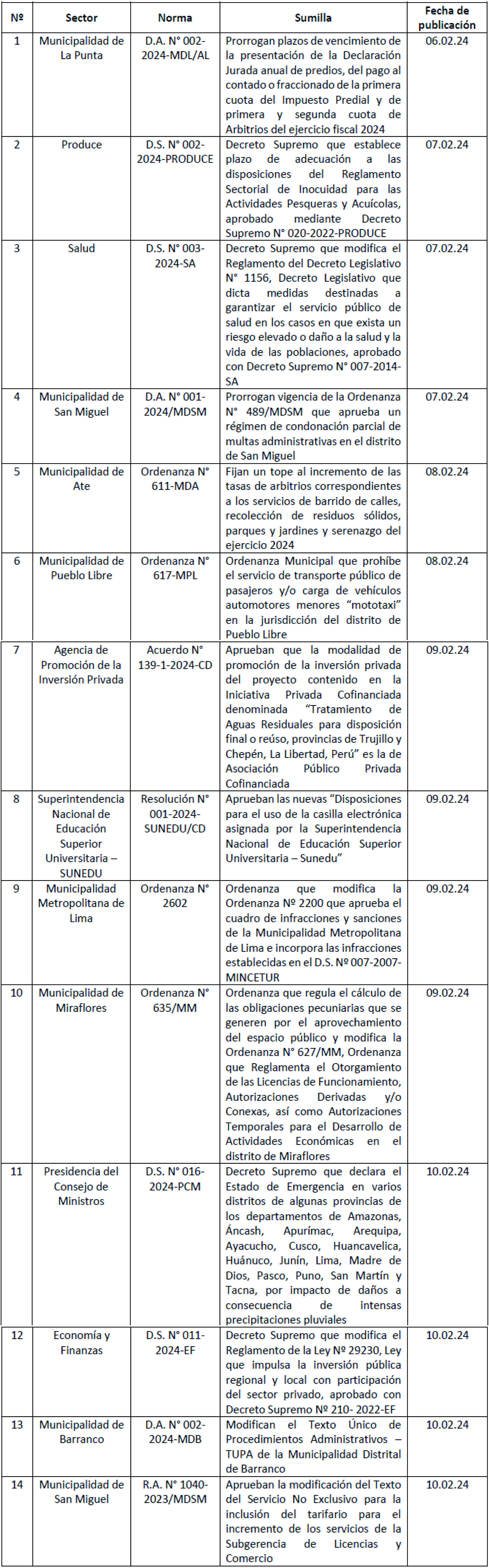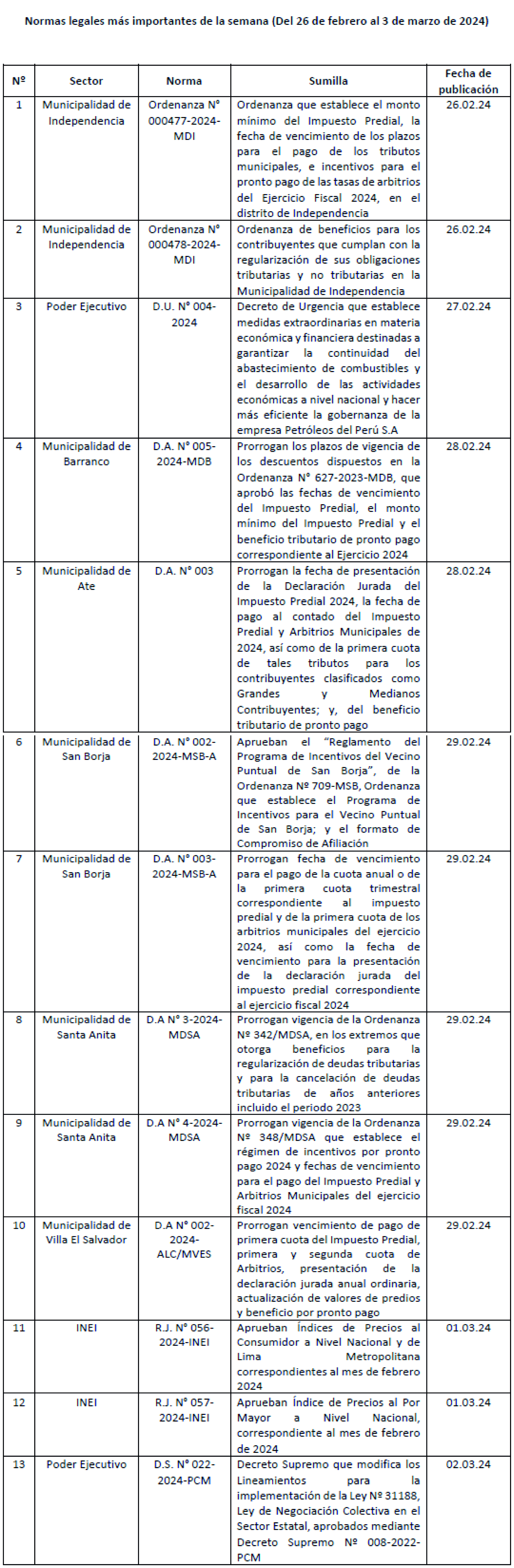 Con fecha 23 de enero de 2024 se publicó la Ordenanza Nº 00348/MDSA, a través de la cual se establece un régimen de incentivos por pronto pago de obligaciones tributarias del Impuesto Predial, Arbitrios Municipales y Derecho de Emisión para el año 2024.