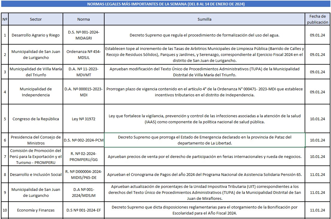 Con fecha 3 de enero de 2024 se publicó el Decreto de Alcaldía Nº 00008-2023/MDSA, a través de la cual se prorroga la Ordenanza Nº 342/MDSA que otorga beneficios de regularización de deudas tributarias y no tributarias que se encuentren vencidas o por vencer en la vía ordinaria o en ejecución de cobranza coactiva.
